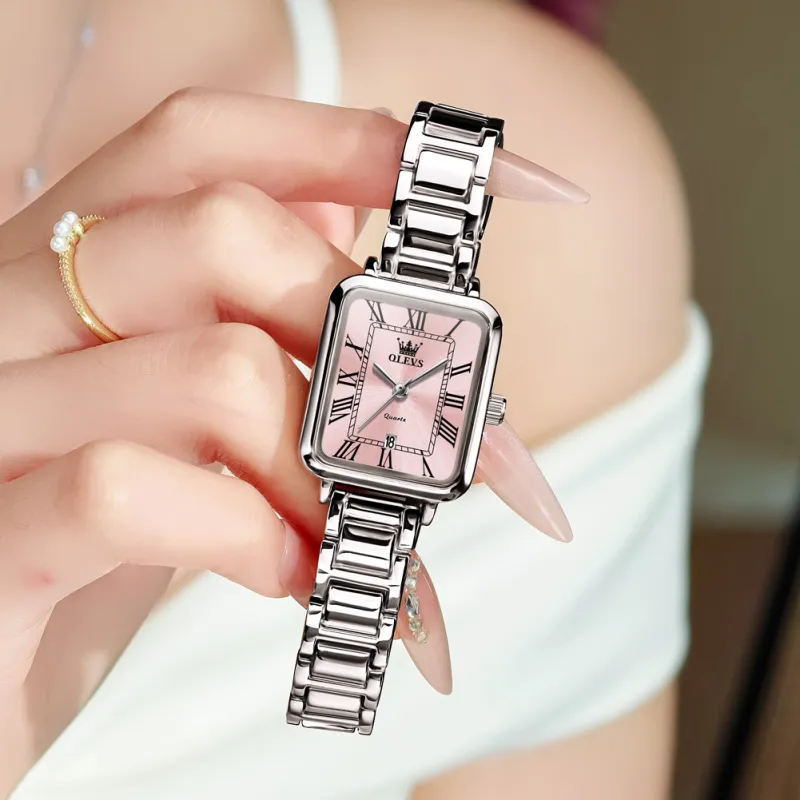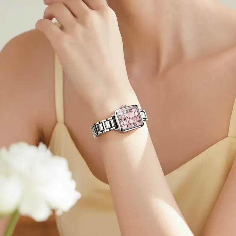 Reloj Inteligente de Cuarzo para Mujer OP-5641-PINK , con Números Romanos, Cuadrado, Estilo Antiguo, Lujoso, Elegante, Dorado, Plateado, Rosa, Resistente al Agua