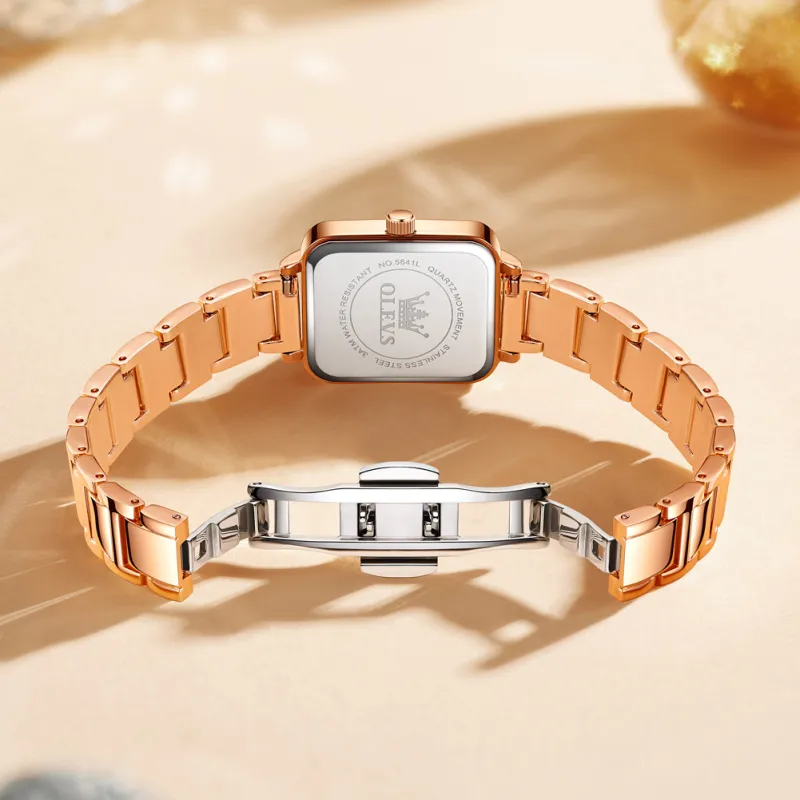 Reloj Inteligente de Cuarzo para Mujer OP-5641-ROSE-PINK , con Números Romanos, Cuadrado, Estilo Antiguo, Lujoso, Elegante, Dorado, Plateado, Rosa, Resistente al Agua