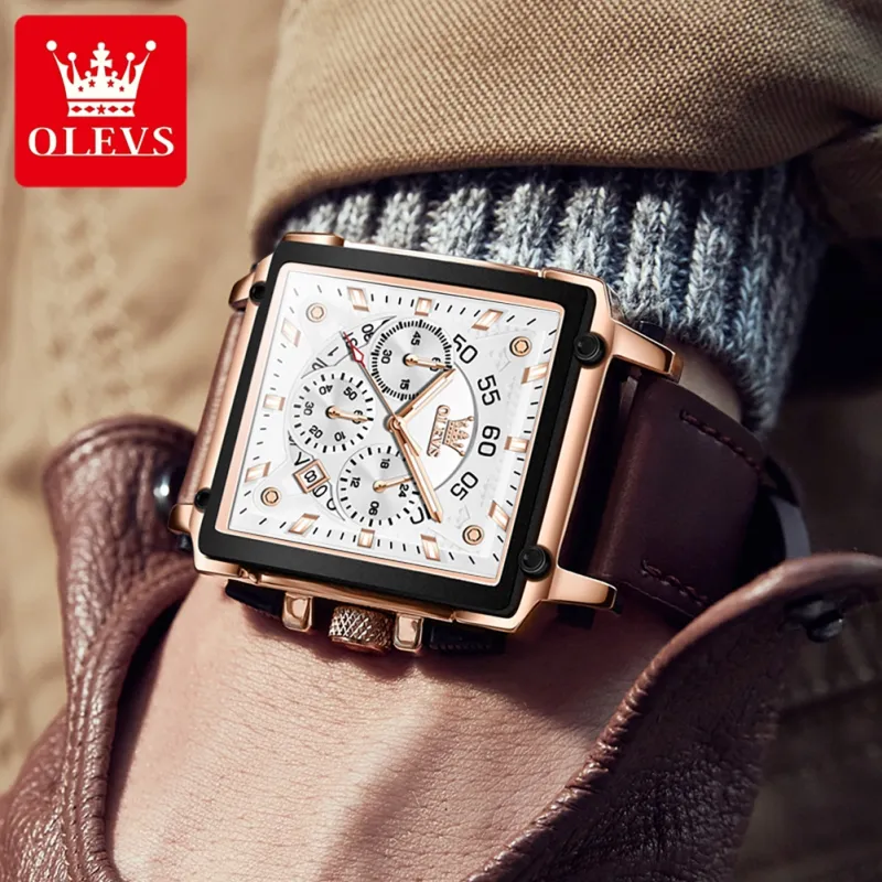 Reloj OLEVS OP-9919, Correa Clásica de Cuero Genuino, Calendario, Multifuncional, Cronógrafo, Reloj de Cuarzo Cuadrado para Hombre