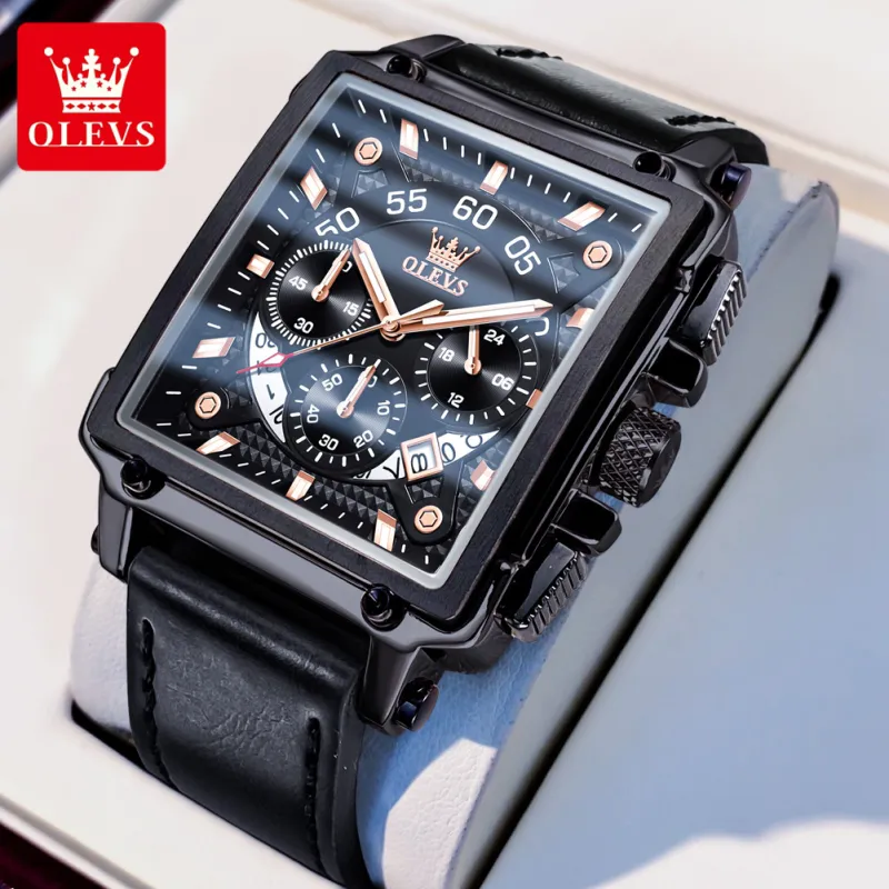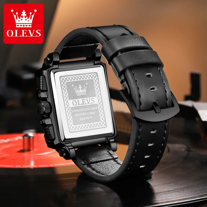 Reloj OLEVS OP-9919, Correa Clásica de Cuero Genuino, Calendario, Multifuncional, Cronógrafo, Reloj de Cuarzo Cuadrado para Hombre