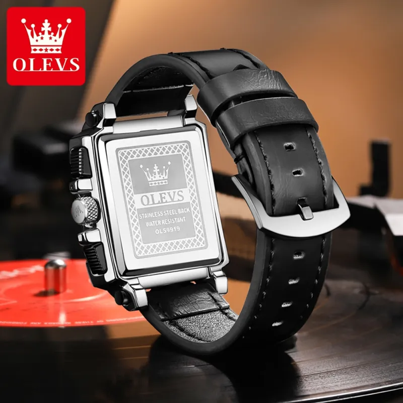 Reloj OLEVS OP-9919, Correa Clásica de Cuero Genuino, Calendario, Multifuncional, Cronógrafo, Reloj de Cuarzo Cuadrado para Hombre