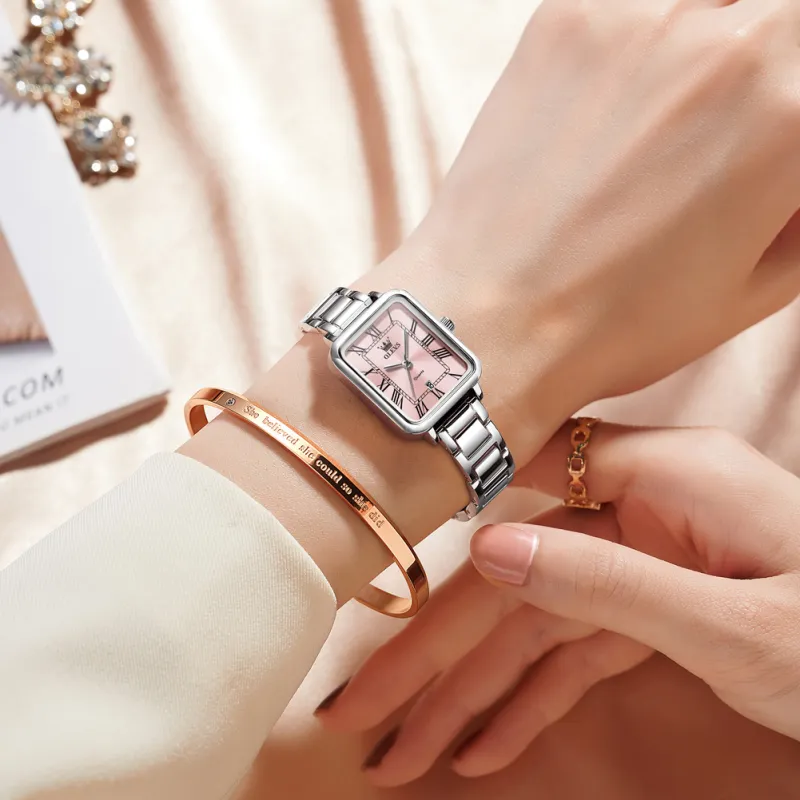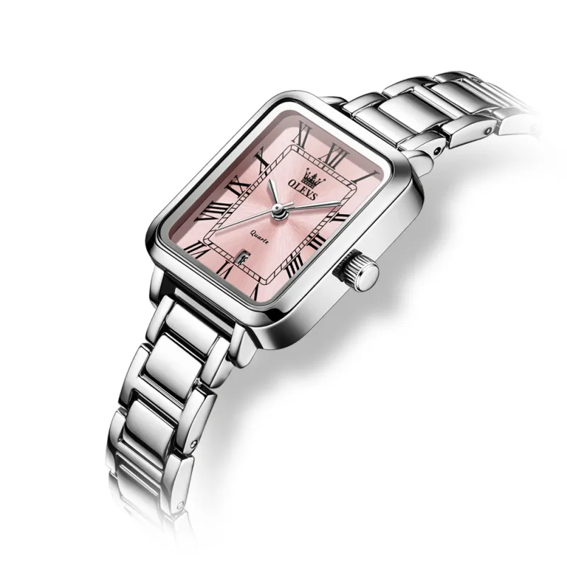 Reloj Inteligente de Cuarzo para Mujer OP-5641-PINK , con Números Romanos, Cuadrado, Estilo Antiguo, Lujoso, Elegante, Dorado, Plateado, Rosa, Resistente al Agua