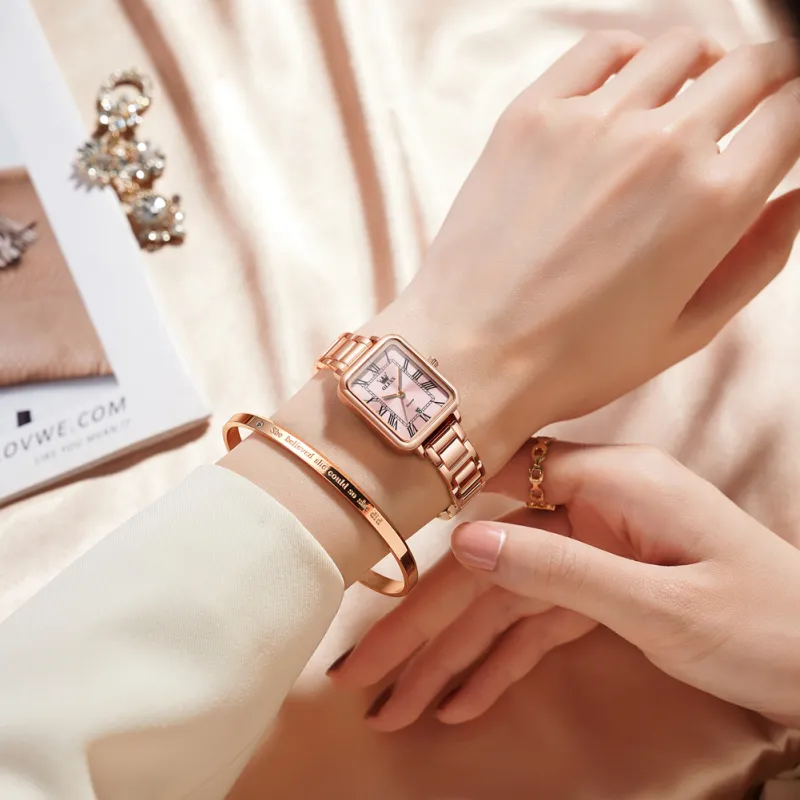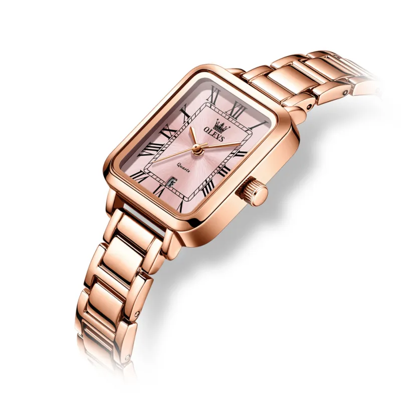 Reloj Inteligente de Cuarzo para Mujer OP-5641-ROSE-PINK , con Números Romanos, Cuadrado, Estilo Antiguo, Lujoso, Elegante, Dorado, Plateado, Rosa, Resistente al Agua