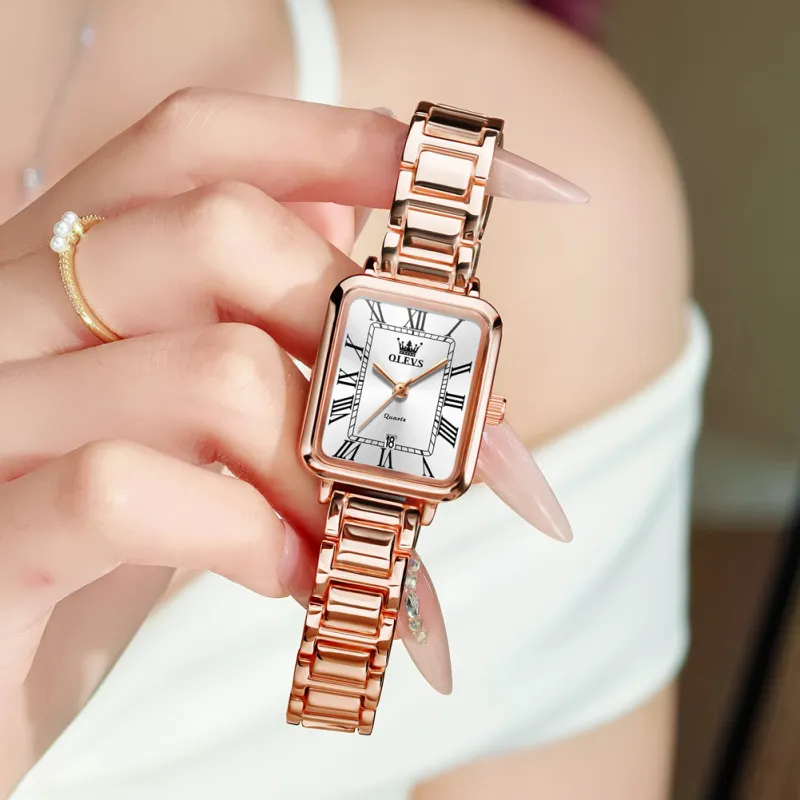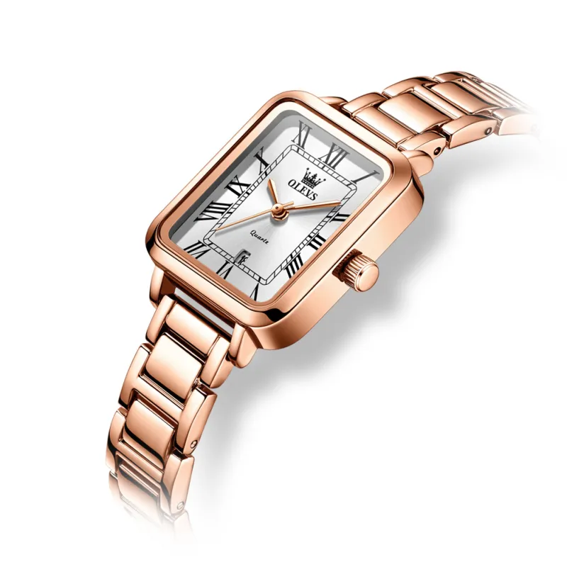 Reloj Inteligente de Cuarzo para Mujer OP-5641-ROSE-WHITE , con Números Romanos, Cuadrado, Estilo Antiguo, Lujoso, Elegante, Dorado, Plateado, Rosa, Resistente al Agua