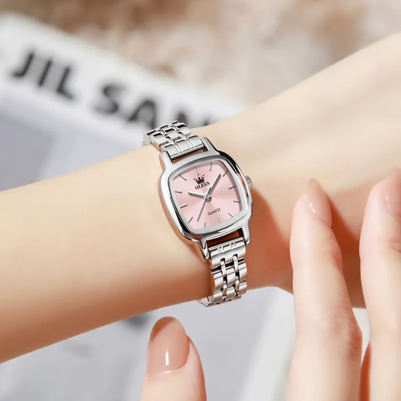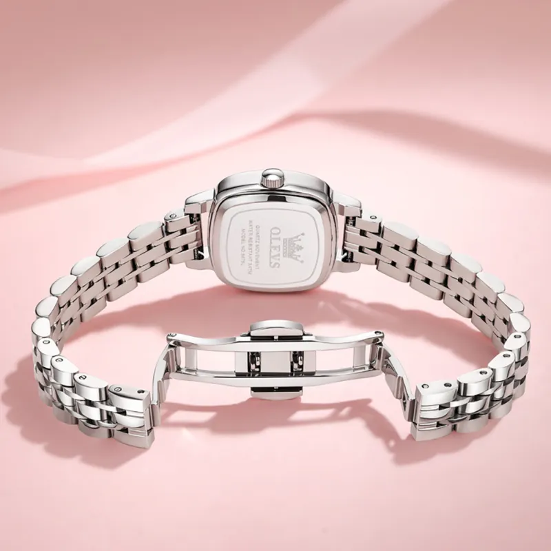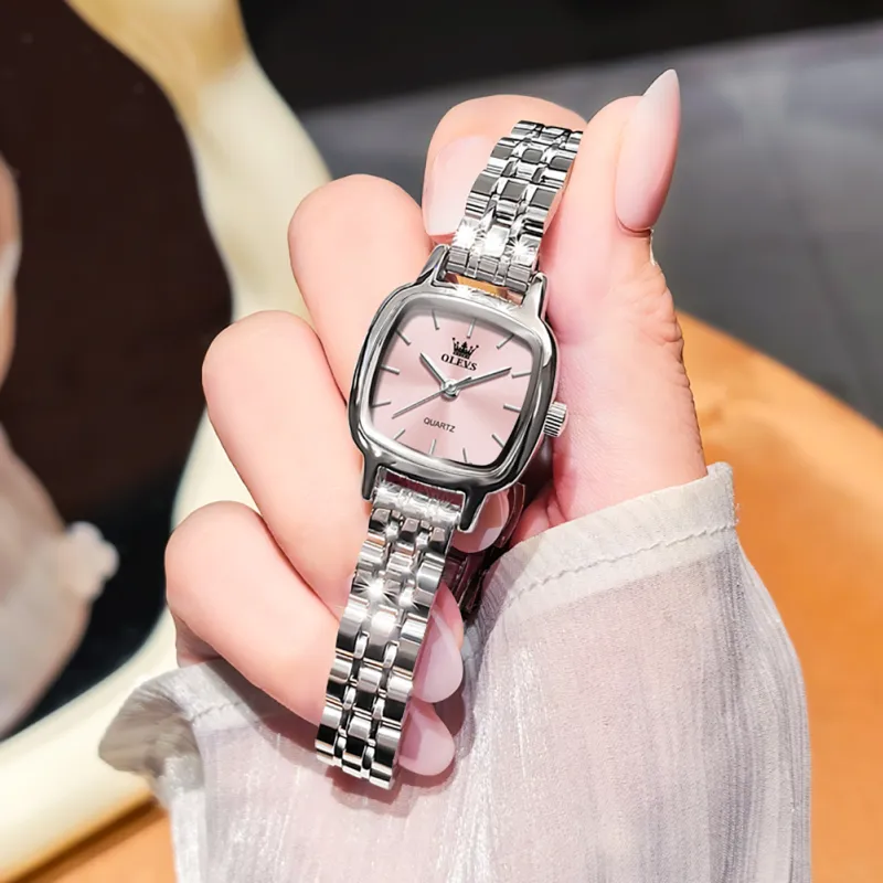 Relojes OP-5675 SILVER PINK para Mujer, Reloj de Cuarzo Cuadrado Elegante de Acero Inoxidable, Resistente al Agua, Luminoso
