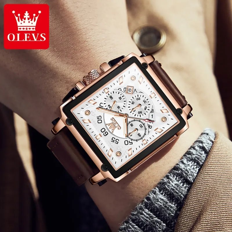 Reloj OLEVS OP-9919, Correa Clásica de Cuero Genuino, Calendario, Multifuncional, Cronógrafo, Reloj de Cuarzo Cuadrado para Hombre