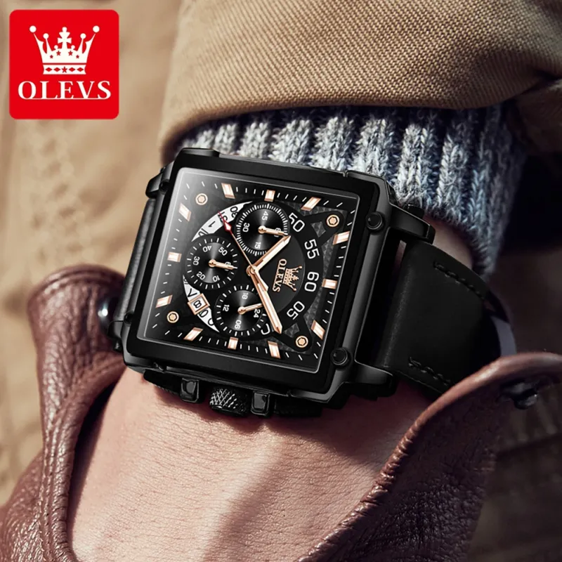 Reloj OLEVS OP-9919, Correa Clásica de Cuero Genuino, Calendario, Multifuncional, Cronógrafo, Reloj de Cuarzo Cuadrado para Hombre