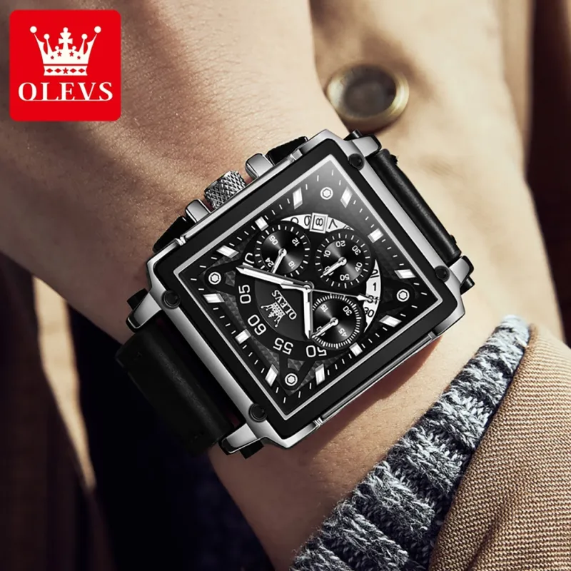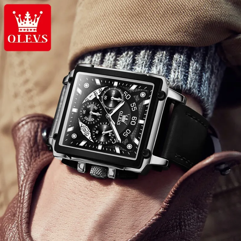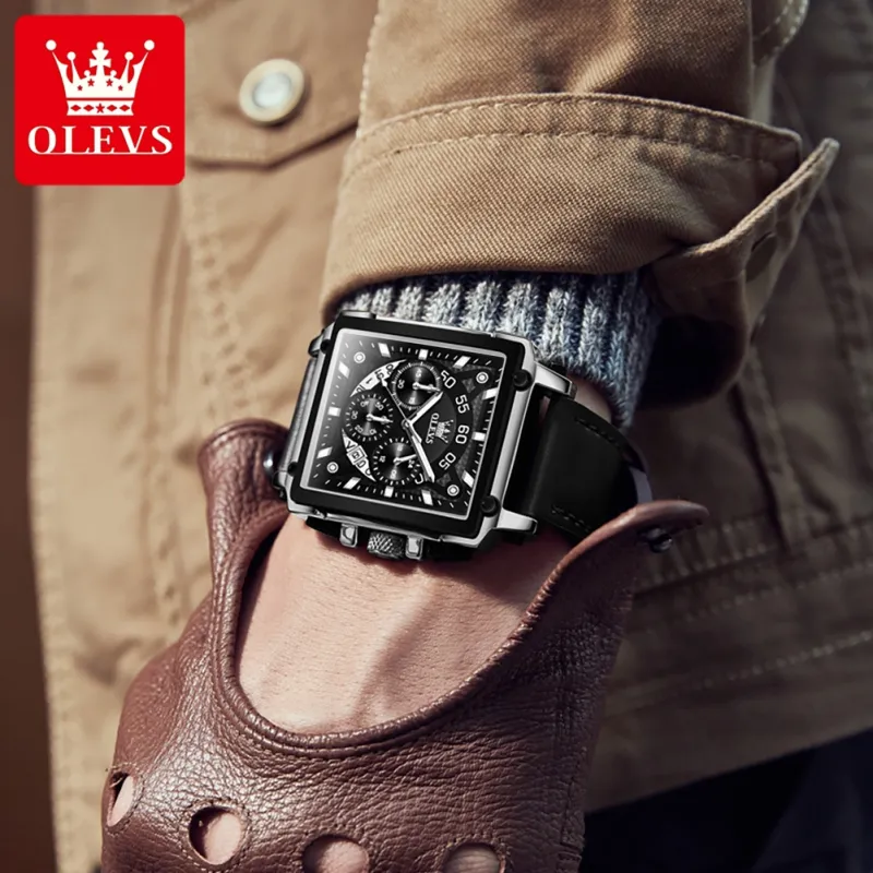 Reloj OLEVS OP-9919, Correa Clásica de Cuero Genuino, Calendario, Multifuncional, Cronógrafo, Reloj de Cuarzo Cuadrado para Hombre