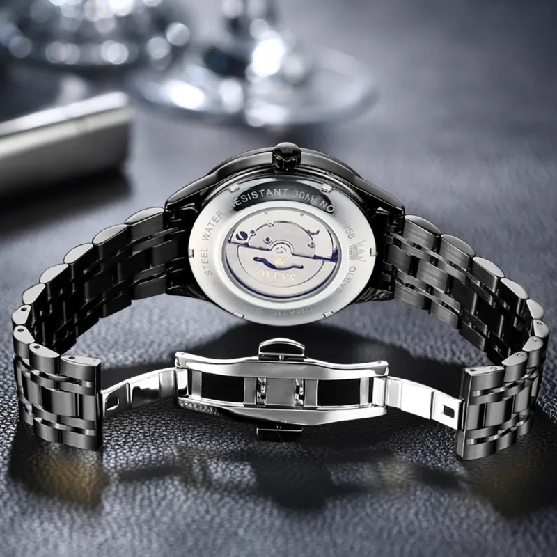 Reloj automático de lujo OLEVS OP-9956. Diseño skeleton con maquinaria visible, fase lunar y acabados premium en acero inoxidable. Elegancia y precisión mecánica.
